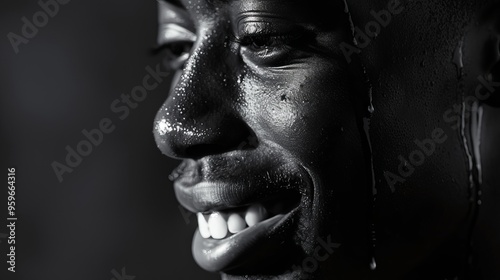 Black and White Portrait of a Man: Intense Contrast of Emotions with a Radiant Smile and Tearful Sadness, Highlighting Duality, Light, and Shadow on His Face