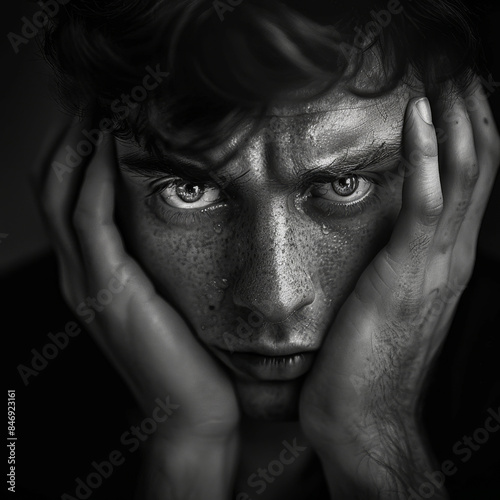 Black and White Portrait of a Sad Distressed Man Holding His Face Depression Mental Health