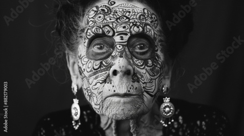 Black And White Portrait Of An Elderly Woman With Intricate Face Paint
