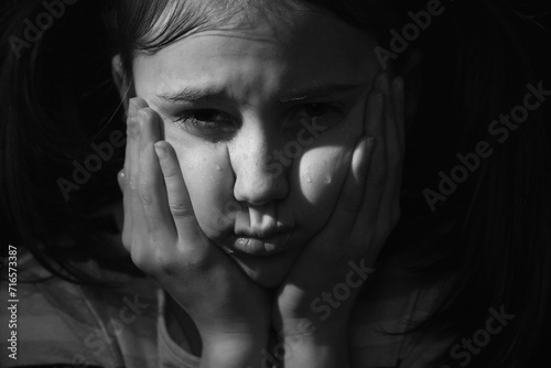Black and white portrait of crying cute little offended child girl . Copy sp0ace.