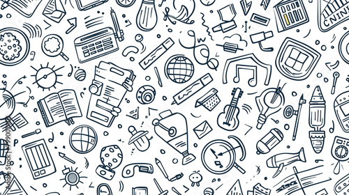 Black and White Seamless Pattern of School and Office Supplies Doodles
