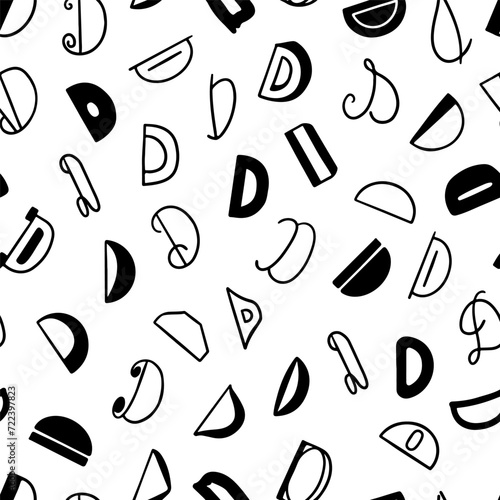 Black and white seamless pattern with the letter D in various styles, hand lettering.