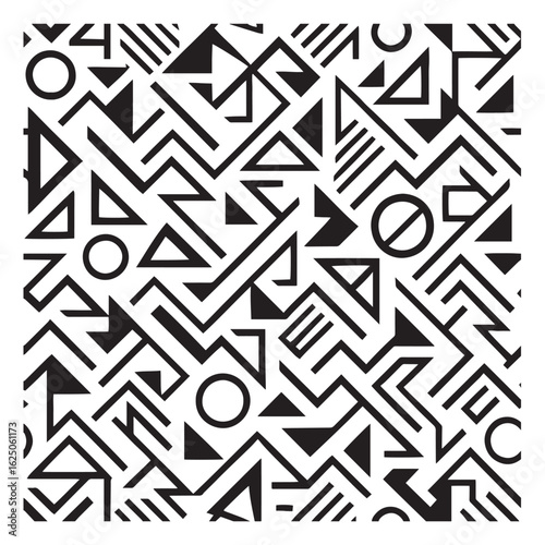 Black and white seamless vector pattern, geometric shapes and lines, modern abstract style, sharp contrast, high detail