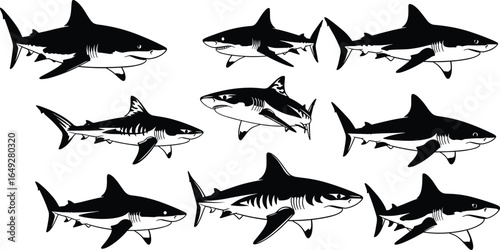 Black and white shark illustrations, stylized shark drawings, cartoon shark anatomy, marine predator sketches, ocean wildlife art, shark fins, gills