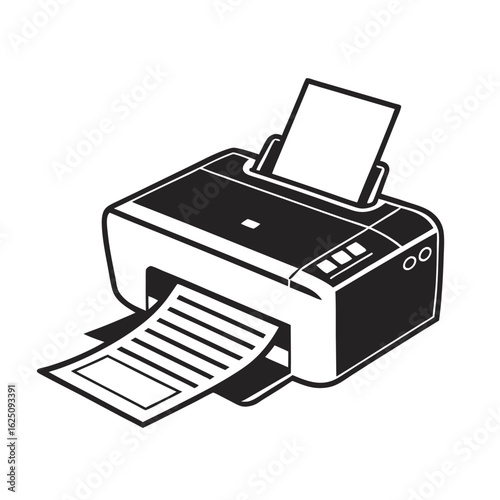 Black and white silhouette of a printer with paper coming out. A simple vector icon for office equipment and technology.