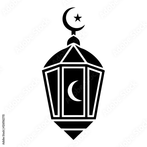 Black and White Silhouette of Islamic Lantern with Crescent Moon and Stars, Islamic icon