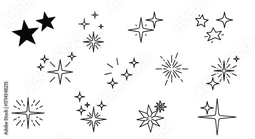 Black and white sketch-style stars with sparkles, decorative cosmic minimal vector pattern.