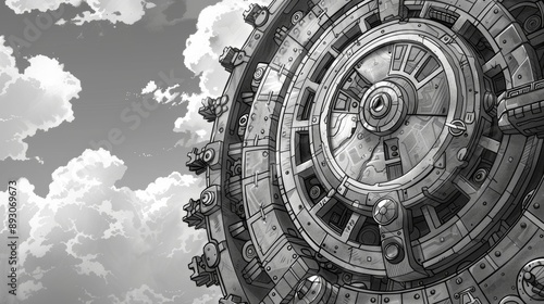 Black and white sketchy illustration featuring cogs with steampunk elements.