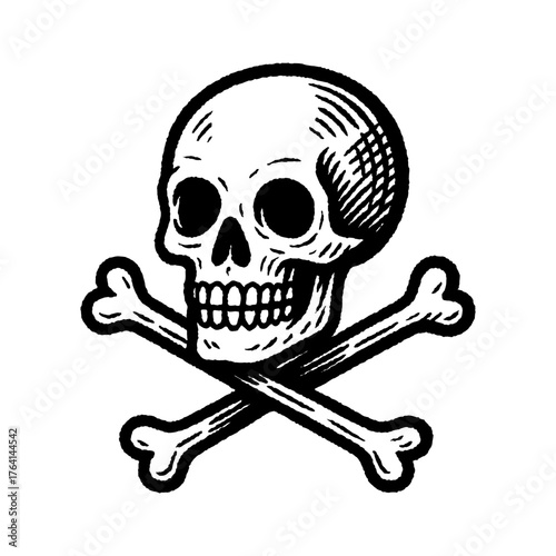 Black and white skull and crossbones illustration in vintage hand-drawn style.