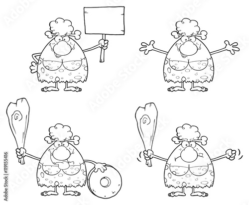 Black And White Smiling Cave Woman Cartoon Mascot Character 2. Collection Set Isolated On White Background