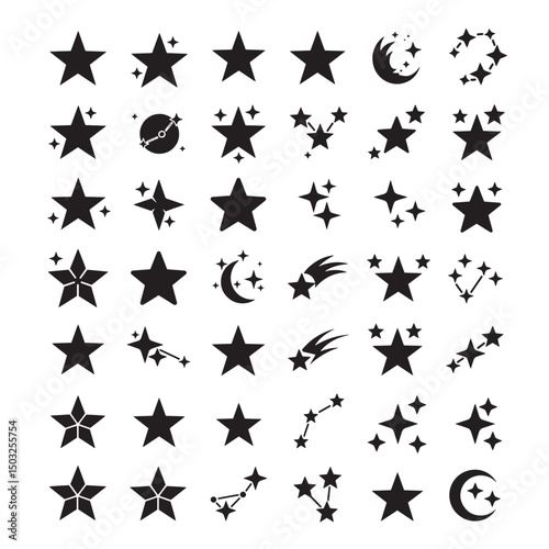 Black and white star icons collection featuring various designs for celestial and decorative uses