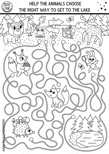 Black and white summer camp maze for children. Active holidays outline preschool printable activity. Family nature trip labyrinth or coloring page with cute woodland animals going to the lake.