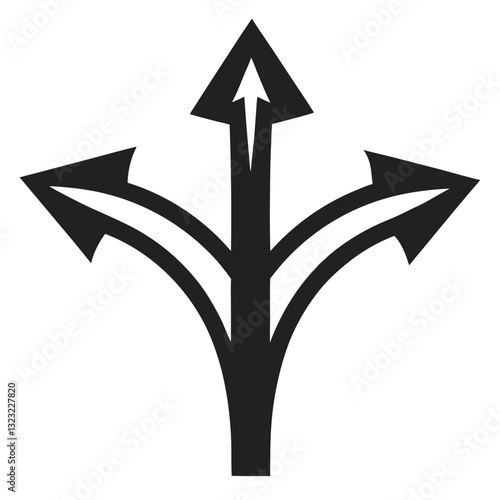 Black and white three-way directional arrow symbol, road sign icon for navigation, choice, decision-making, and multiple path directions