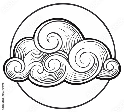 Black and white traditional Asian cloud or wave illustration with engraved swirls in a circular frame