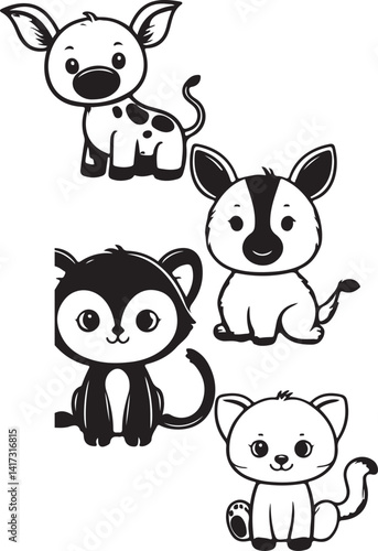 Black and white vector clip art shows four cute animal illustrations. Likely created with generative AI tools, the file is ready to upload to Adobe Stock.