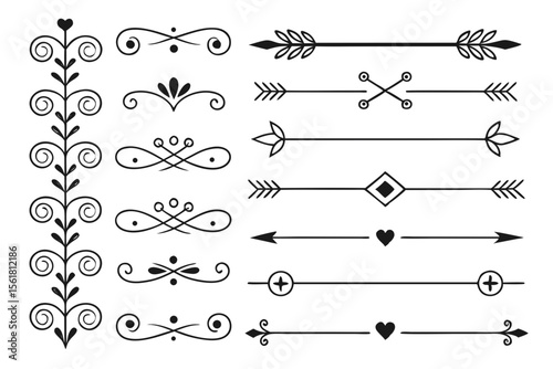 Black and White Vector Dividers with Elegant Swirls, Arrows, and Floral Borders. Hand-Drawn Line Art for Decorative Design, Invitations, Posters, and Layout Templates.