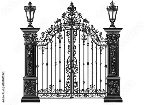 Black and white vector illustration an ornate Victorian-style metal gate with architectural detail, simple design, flat shape, symmetrical, clip art, isolated on a solid pure white background.