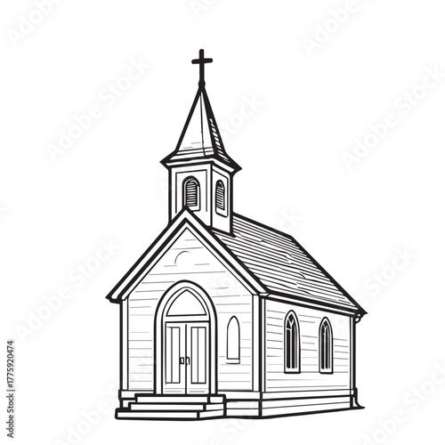 Black and white vector illustration of a chapel, featuring simple architectural lines, a cross on top, and serene minimalist style symbolizing peace, faith, and timeless beauty.