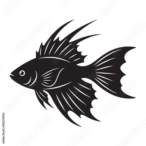 Black and white vector illustration of a spiky tropical fish silhouette on a white background perfect for logos and designs