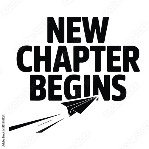 Black and white vector illustration of bold modern “New chapter begins” typography with a stylized paper airplane symbolizing a new journey