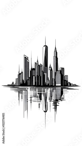 Black and white vector illustration of the New York City skyline, on a white background, with a minimalistic design featuring clean lines and a simple drawing style
