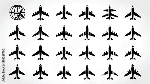 Black and white vector set of birds, airplane, and mountain silhouettes with cross icon design