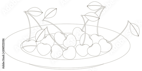 Black and white whole cherry berries lie on a plate. Coloring. Vector.