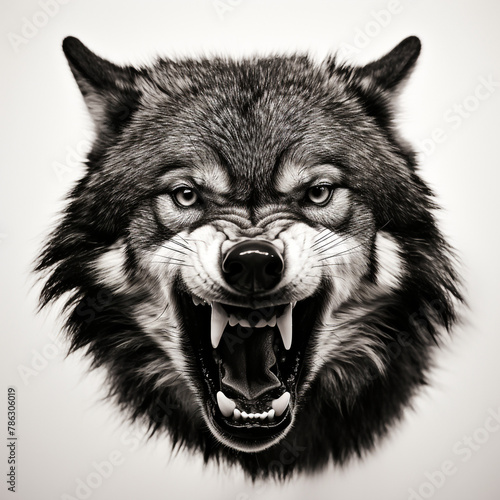 black and white wolf, mouth open snarling, contrast, white background сreated with Generative Ai