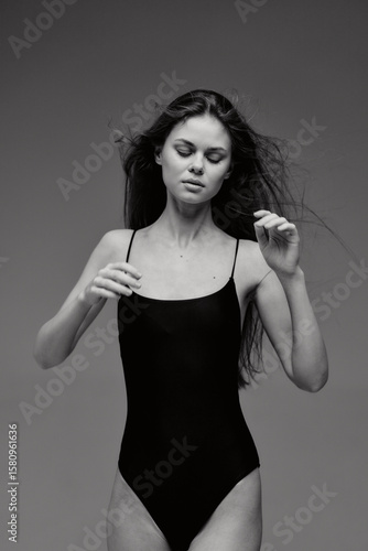 black and white woman wearing black swimsuit with flowing hair posing simply on gray background with calm expression and natural lighting in studio setting