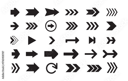 Black Arrow Icons Set. Chevron, Bold, and Circular Direction Symbols Collection