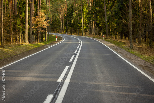 Black asphalt road, single lane in the middle of green coniferous forest - early spring