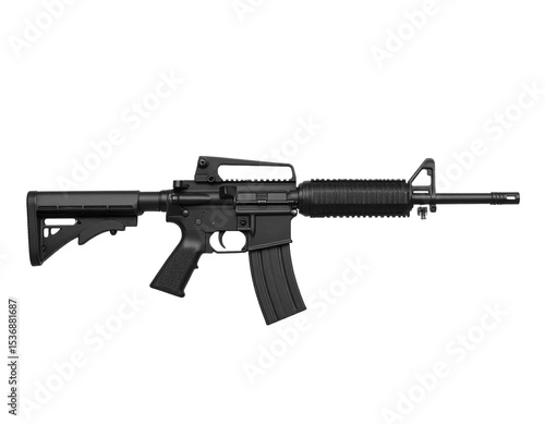 Black assault rifle side view isolated on white, modern tactical firearm.