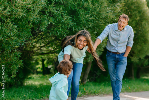 Black baby, mother, father together in the park. Multi-ethnic, African-American and European family walking down the road holding hands.