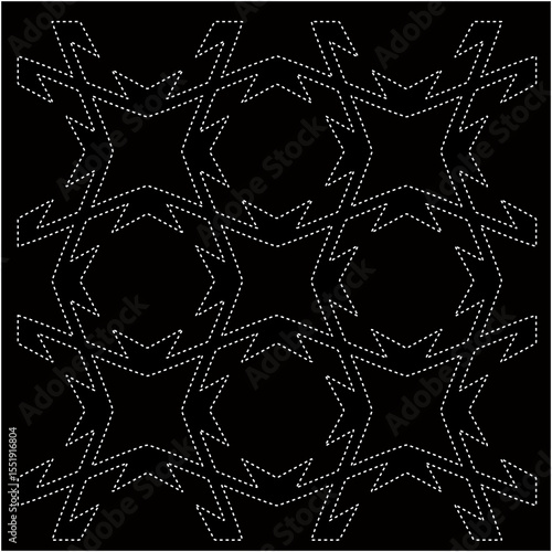 Black background with figures from dots . Black and white pattern for web page, textures, card, poster, fabric, textile. Repeating design.