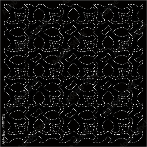 Black background with figures from dots . Black and white pattern for web page, textures, card, poster, fabric, textile. Repeating design.