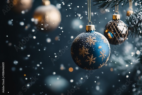 Black background with gold and dark blue Christmas decorations, creating an elegant frame for text or graphics. The design features pine branches, glittery ornaments, golden sprinkles, and small metal