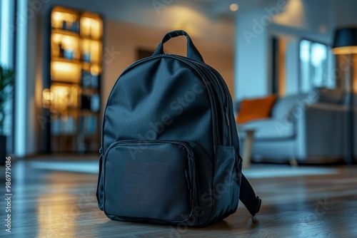 Black Backpack on a Wooden Floor in a Modern Living Room