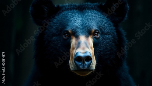 black bear portrait, close-up, intense gaze, striking eyes, dark background, detailed fur texture, wildlife photography, dramatic lighting, high contrast, realistic, majestic animal, powerful predator