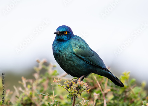 Black bellied starling perched on a branch and looking to the left