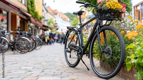 Black Bicycle with Flowers in Basket Parked on Cobblestone Street