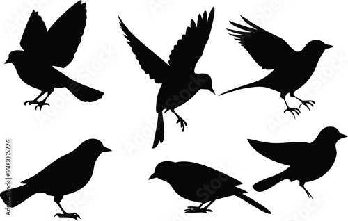 Black Bird Silhouettes Featuring Flying and Perched Birds on a White Background