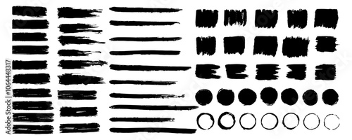Black brush strokes. Large set of vector text boxes. Grunge texture. Abstract stains. Hand drawn circles, squares and stripes on white background. EPS 10.