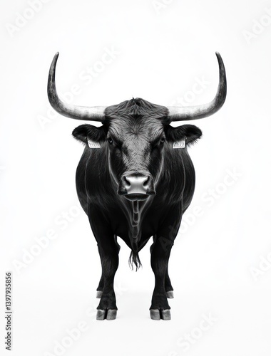 Black bull standing in a white background. Stock photography for farm, livestock, agriculture