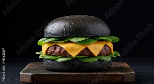 Black burger with cheese and lettuce on a wooden board against dark background.