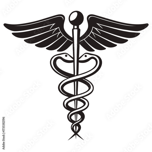 Black Caduceus Symbol with Wings and Two Snakes on White Background medical health