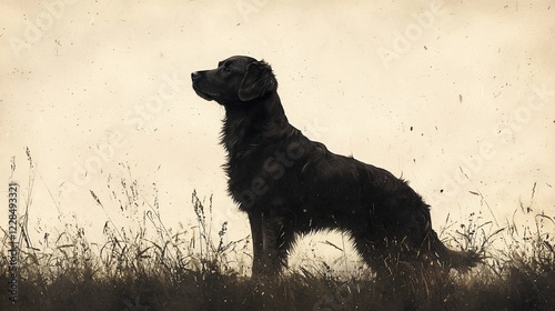 Black Canine Standing Tall Amidst Grass Field in Sepia Tone Vintage Style Photography