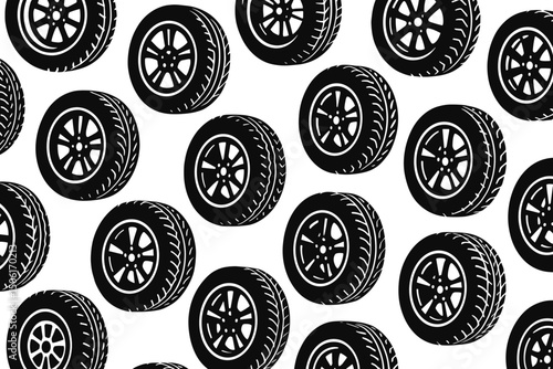 Black car tire wheel silhouettes seamless repeating pattern vector background automotive vehicle transport garage service design graphic texture wallpaper