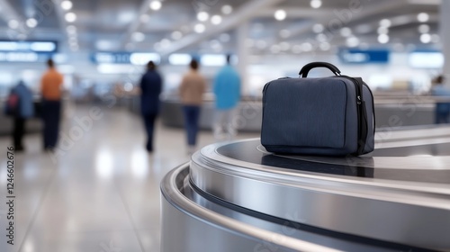 Black carry-on bag on baggage claim carousel at airport with blurred traveler in background