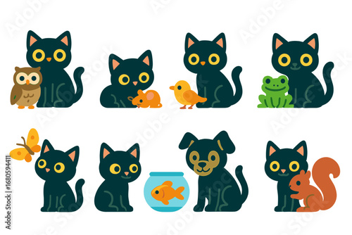 Black Cat and Friends. Flat vector mini-illustrations black cat with other animals in colors children's illustrations: black cat