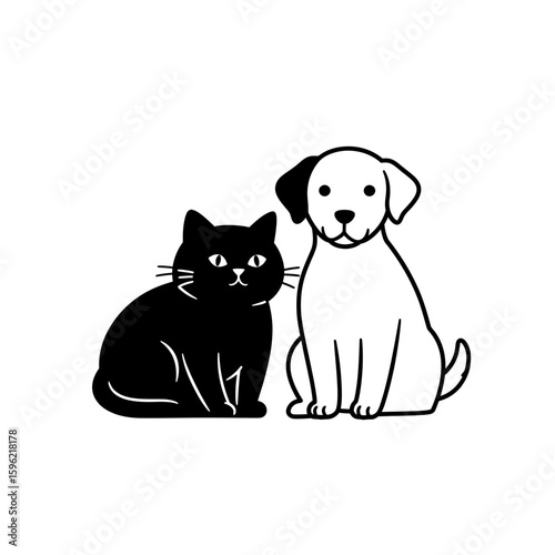Black cat and white dog sitting next to each other silhouette